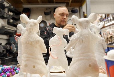 A dozen print images of the mice, the models, are set up as a backdrop to the wire-frame armature. More than 35 sculpting tools lay on the table around it. Freitas turns his effort to a mouse he’s sculpting. The specs call for the commission to withstand freezing temperatures that characterize the winter show.